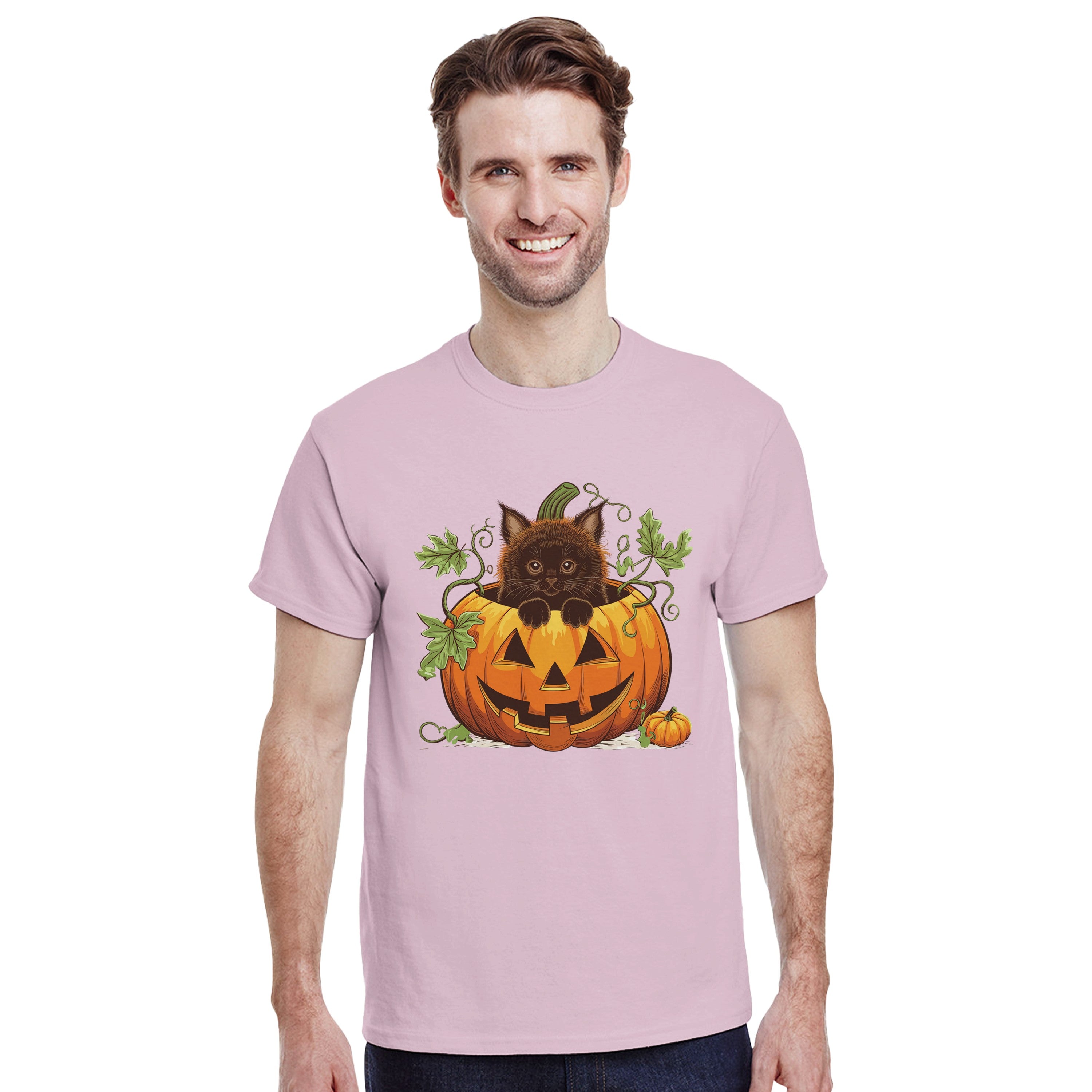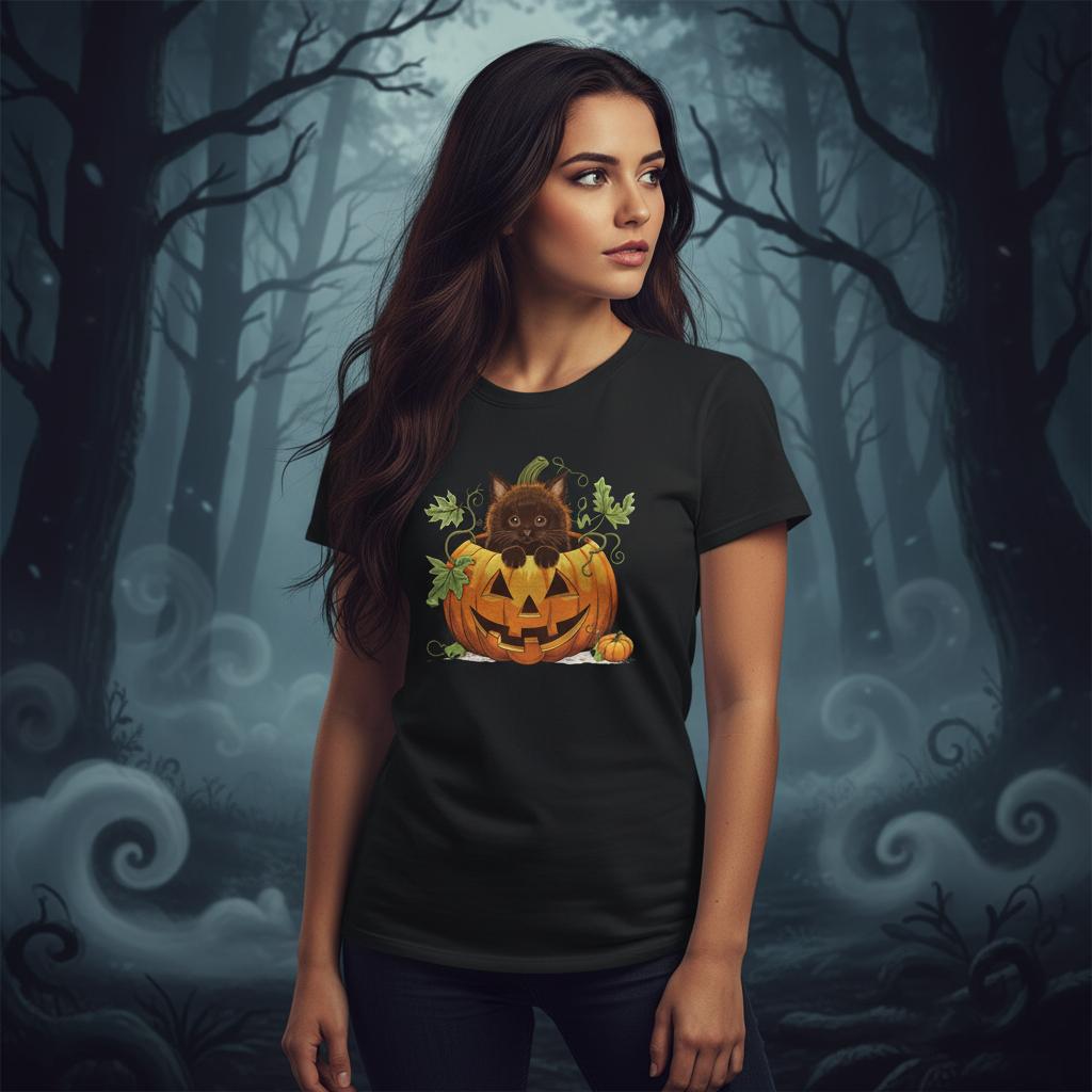 Delight the folks you meet this Autumn season with our Cute Black Cat & Scary Pumpkin T-Shirt. This charming design features an adorable black cat popping out of a spooky pumpkin, guaranteed to bring joy and smiles.