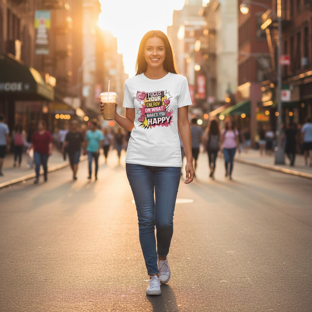 Elevate your spirit and align your wardrobe with happiness in mind with our "Focus Your Energy on What Makes You Happy" T-Shirt! 🌟 This piece isn’t just clothing; it’s a statement that embodies positivity and a zest for life.