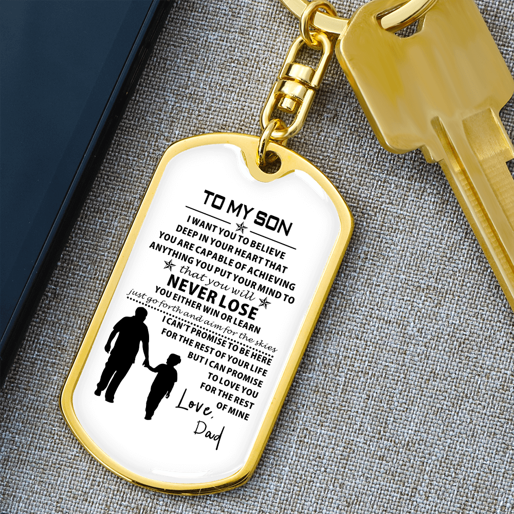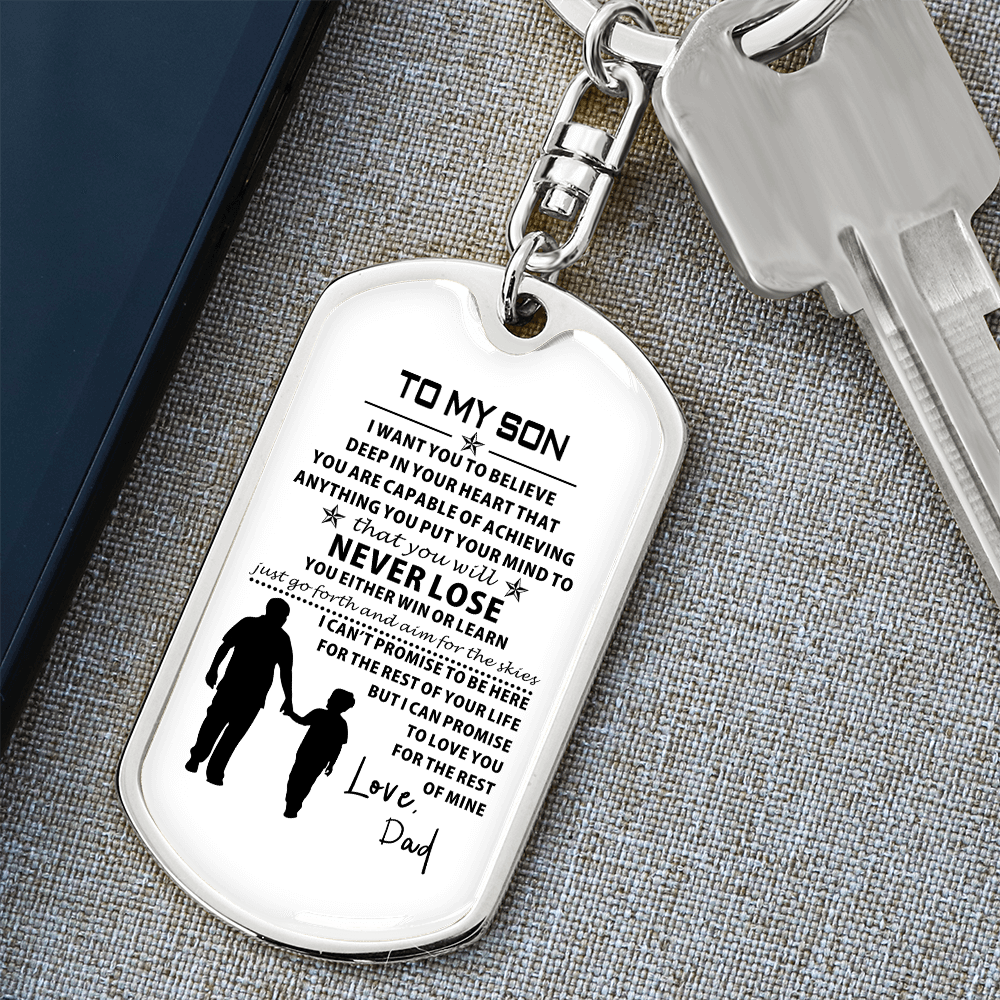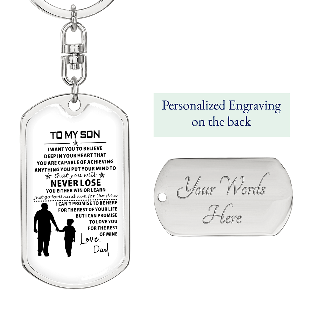 Show off your keepsake by taking care of it along the way.Hold close the tender, unbreakable bond between father and son with the To My Son from Dad Dog Tag from LoveRemembersMe, a heartfelt keepsake crafted for the Sentimental Romantic who treasures family ties with every beat of their heart. This durable dog tag, gleaming with a subtle yet proud design, carries the soul-stirring message “To My Son from Dad,” a whispered promise of love and guidance that resonates deeply for your dad or grandpa who pours their life into raising you. Imagine the quiet emotion in his eyes as he wears it near his heart, a daily reminder of the strength and warmth you share, perfect for the busy soul weaving love into a hectic life.