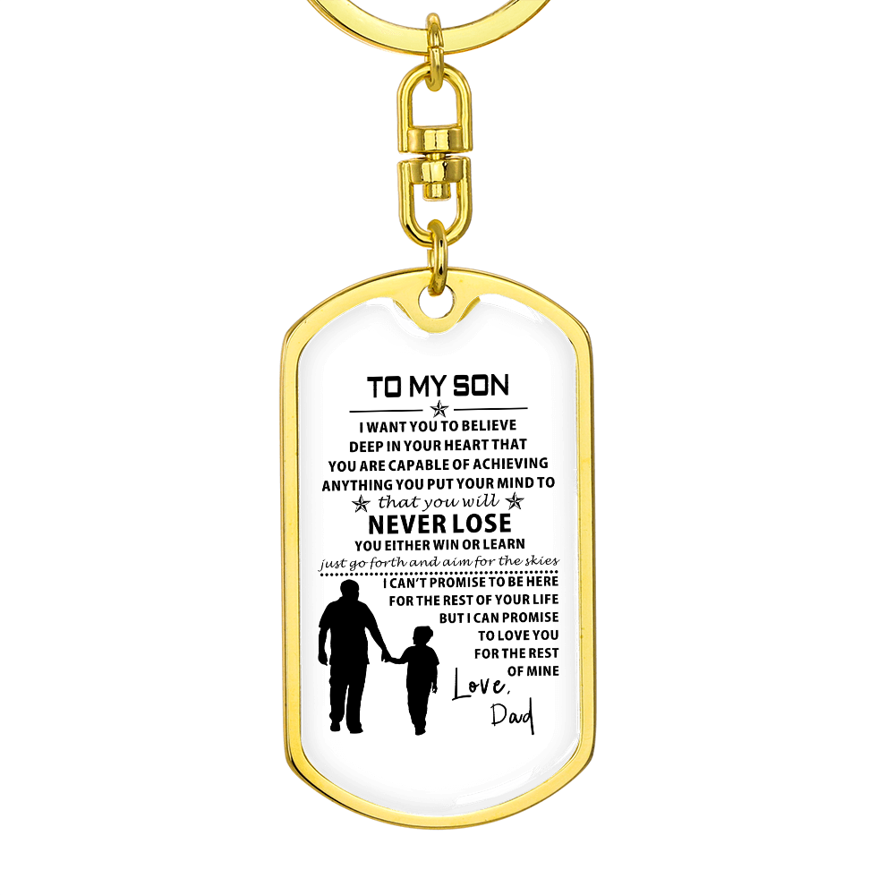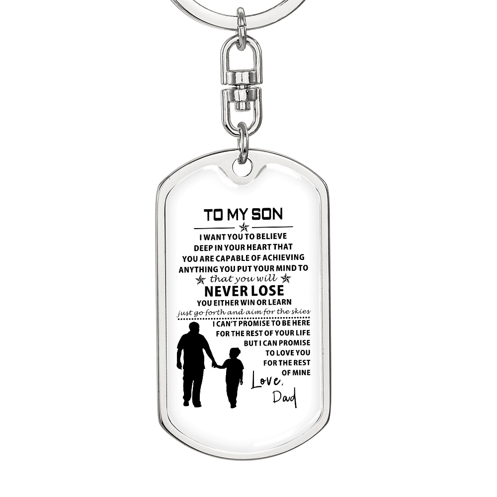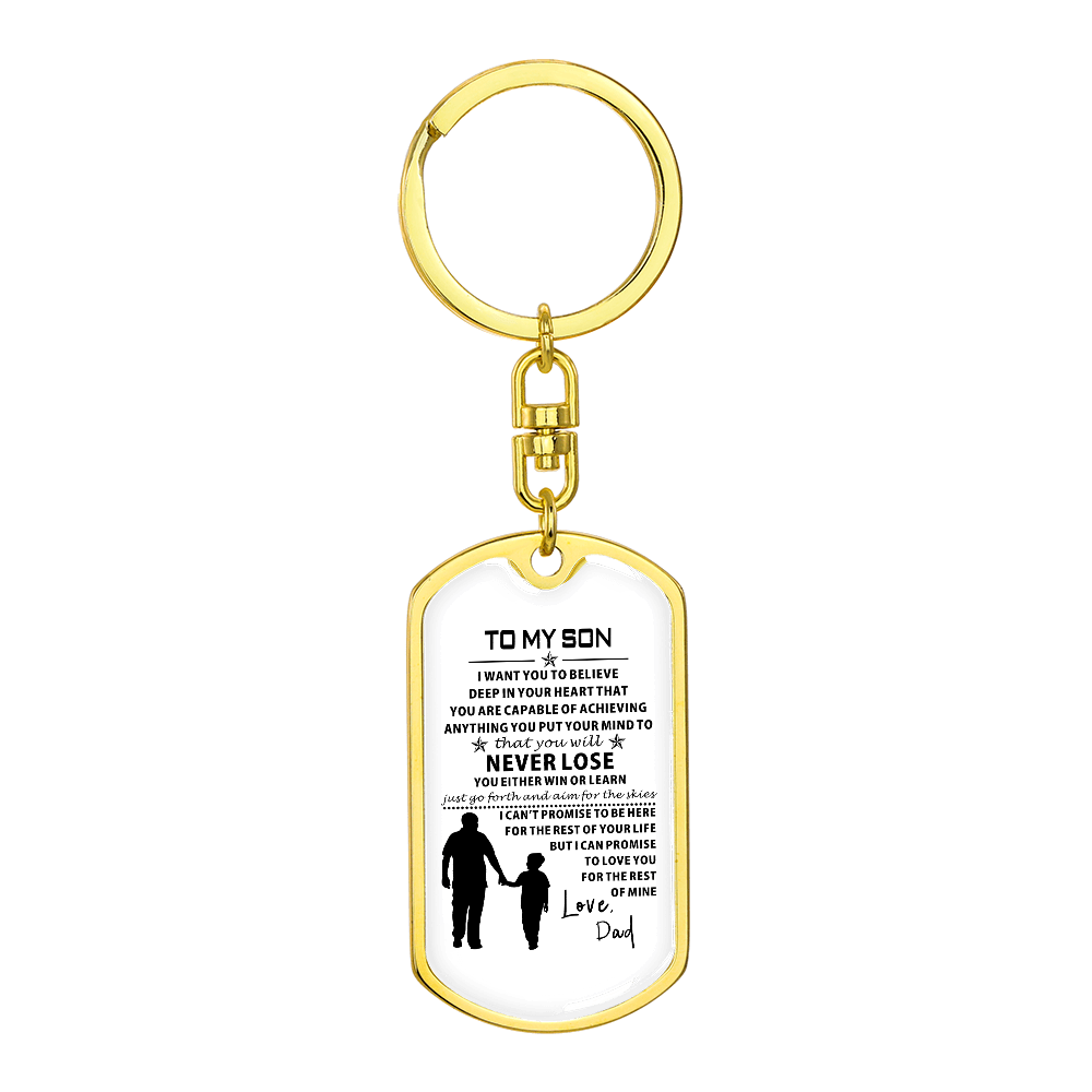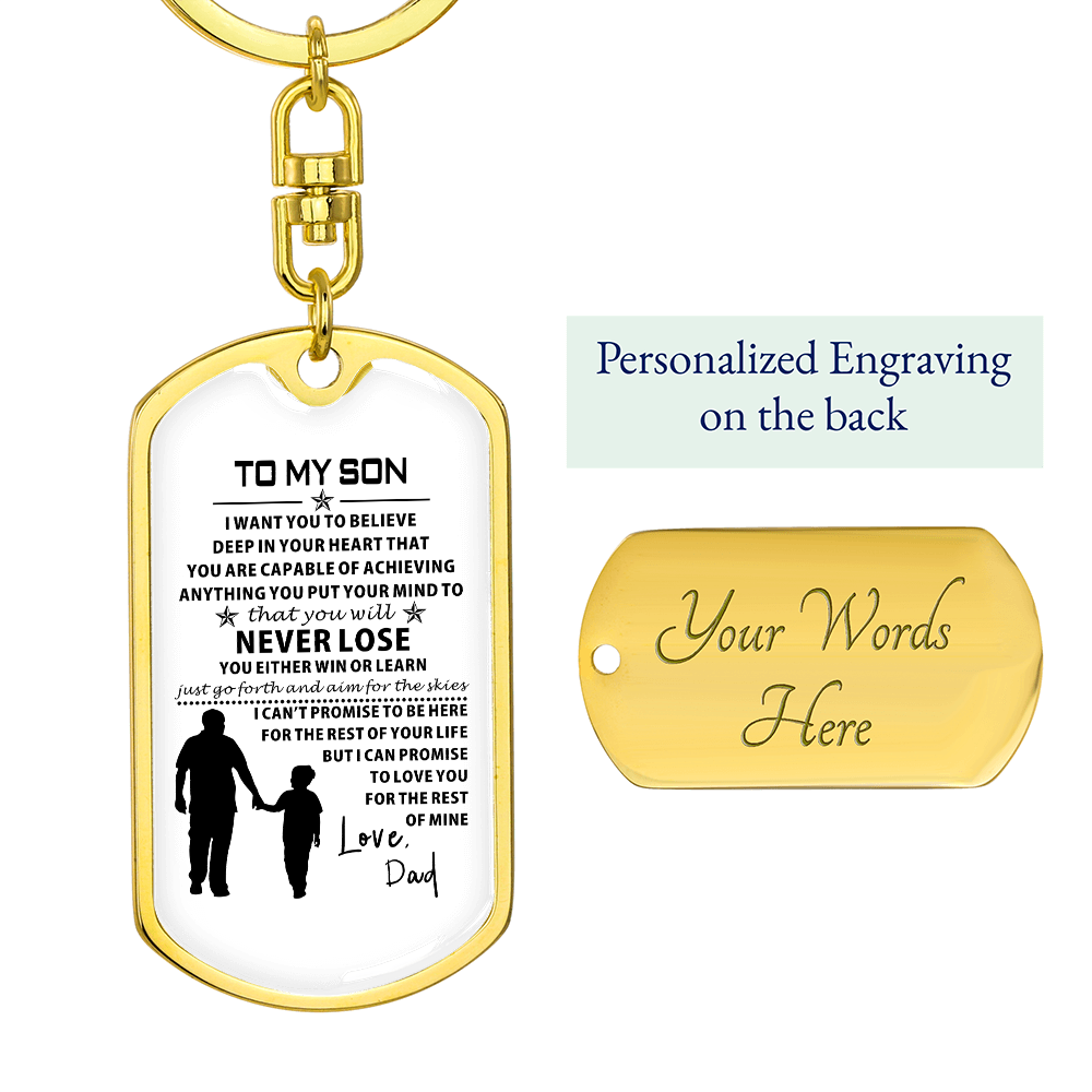 Show off your keepsake by taking care of it along the way.Hold close the tender, unbreakable bond between father and son with the To My Son from Dad Dog Tag from LoveRemembersMe, a heartfelt keepsake crafted for the Sentimental Romantic who treasures family ties with every beat of their heart. This durable dog tag, gleaming with a subtle yet proud design, carries the soul-stirring message “To My Son from Dad,” a whispered promise of love and guidance that resonates deeply for your dad or grandpa who pours their life into raising you. Imagine the quiet emotion in his eyes as he wears it near his heart, a daily reminder of the strength and warmth you share, perfect for the busy soul weaving love into a hectic life.