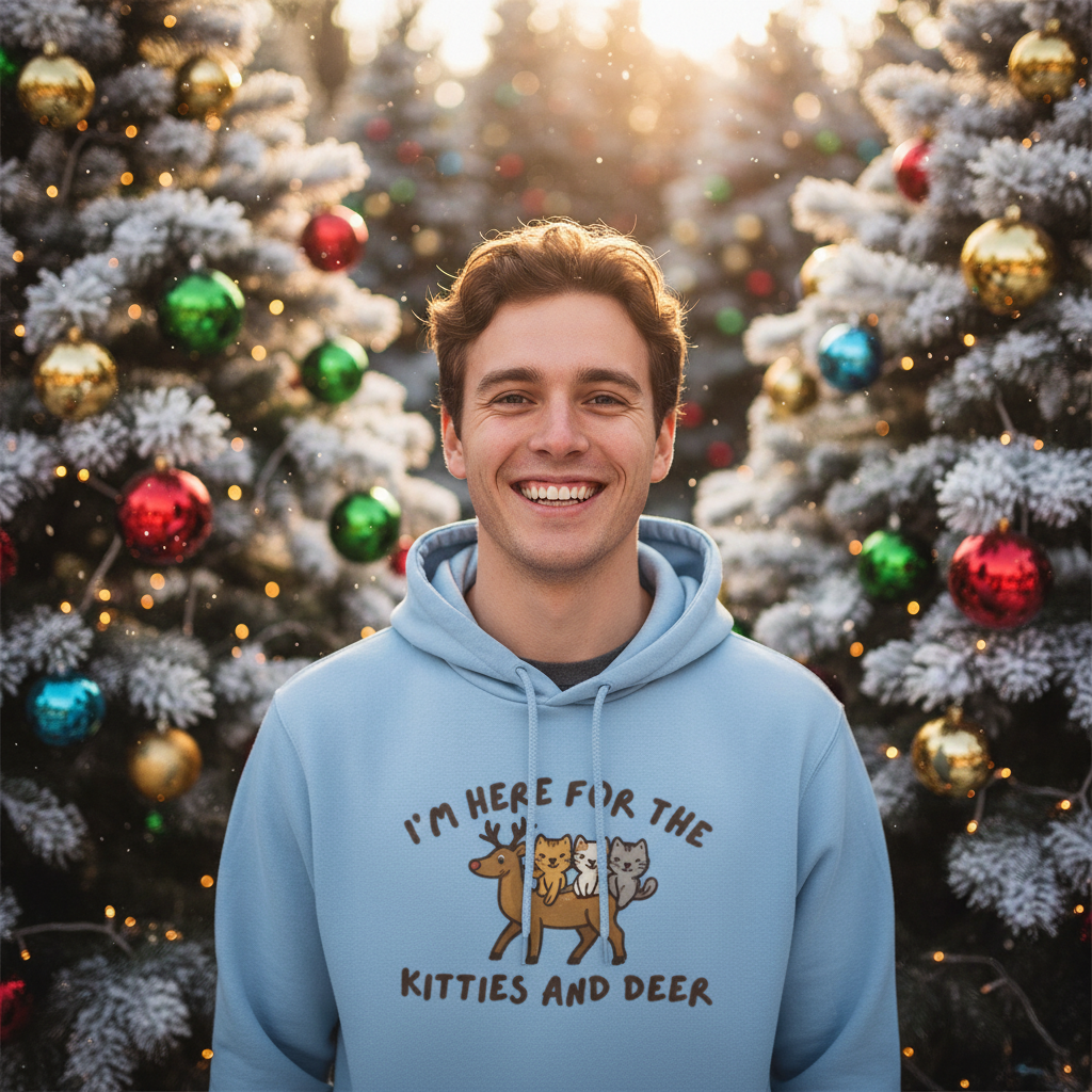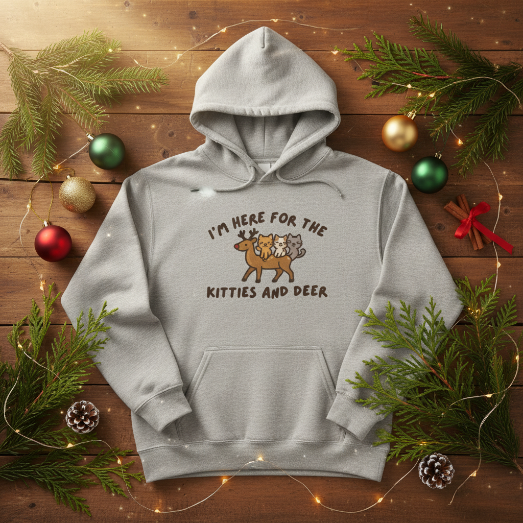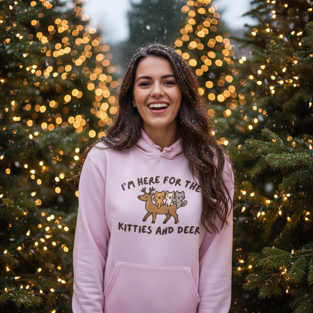 Add a playful touch to your festive celebrations with our delightful sweatshirt (and/or hoodie) featuring the cheeky phrase, "I'm Here for the Deer and Kitties." This clever design is sure to bring joy and laughter to your holiday gatherings, making it a perfect conversation starter.